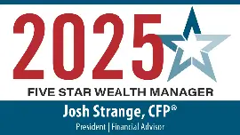 Five Star Award issued to Joshua Strange. Award based on 10 objective criteria associated with providing quality services to clients such as credentials, experience, and assets under management among other factors. Wealth managers do not pay a fee to be considered or placed on the final list of Five Star Wealth Managers.